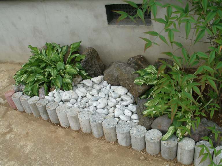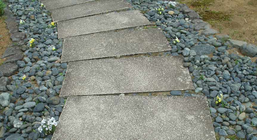以前に青黒っぽい石を、同じ場所で拾って来て、通路脇に敷いて、水を表現した事もあります。