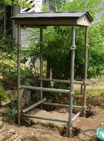 唐突ながら、実はこの屋根、井戸ポンプ用の屋根だったのですが不要になり、捨てるにしては、まだ綺麗なのでモッタイナク・・しかし、使い道も無くジャマにはなると言うシロモノでした。