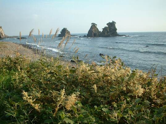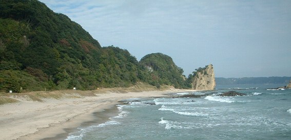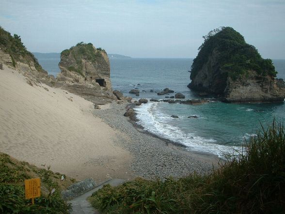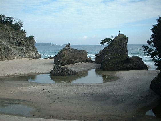 同じく「逢ケ浜海岸」で、左が「姑岩」右の二つ岩が「雀岩」