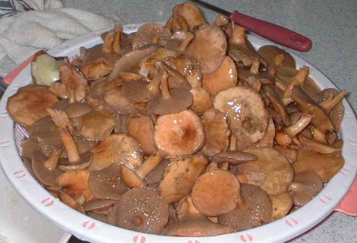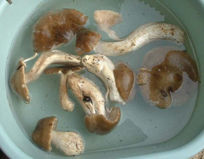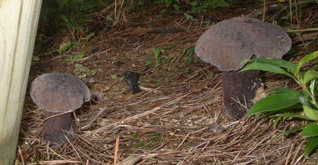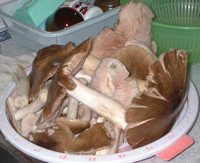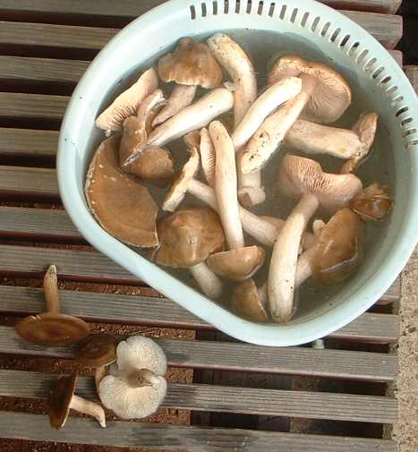 洗面器に入ってるのが「ウラベニホテイシメジ」、外に出してある4本は「ハタケシメジ」です。