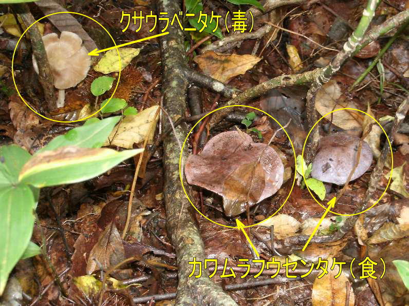 左上のキノコは「クサウラベニタケ」で、σ(*_*)が良く採る「ウラベニホテイシメジ」と似ており、先日まちがってこのキノコが入ってるのを販売して食中毒起こしたというニュースが有りました。