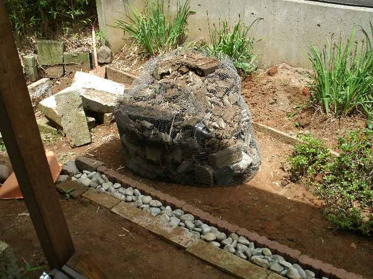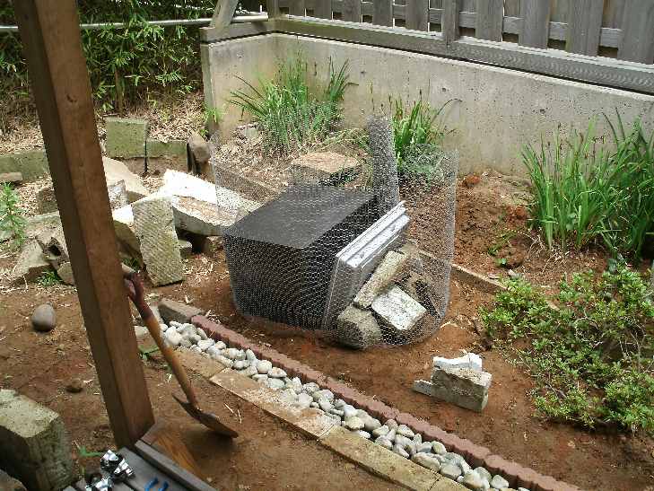 金庫を息子と二人がかりで庭に引きずり出し、その周囲に金網を張り、中にこれまたジャマになっていた石ころを入れました。