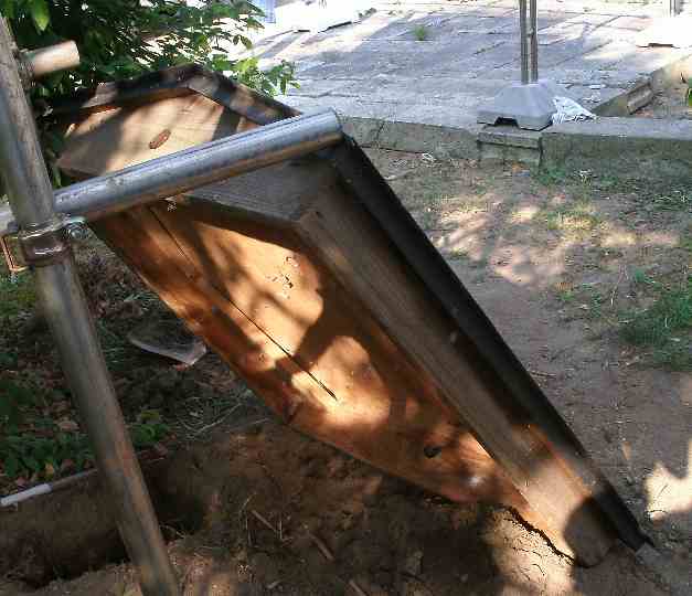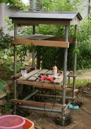 唐突ながら、実はこの屋根、井戸ポンプ用の屋根だったのですが不要になり、捨てるにしては、まだ綺麗なのでモッタイナク・・しかし、使い道も無くジャマにはなると言うシロモノでした。
