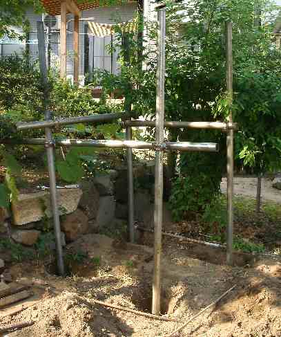 先ずは屋根の内側寸法に合わせて、適当な深さにで四隅に穴を掘りました。