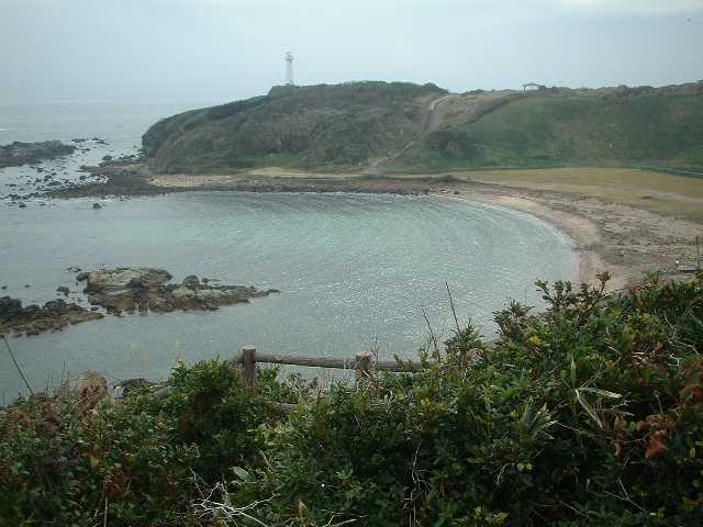 写真右奥に白い建物が有る所から、車で岬を越える事ができます。