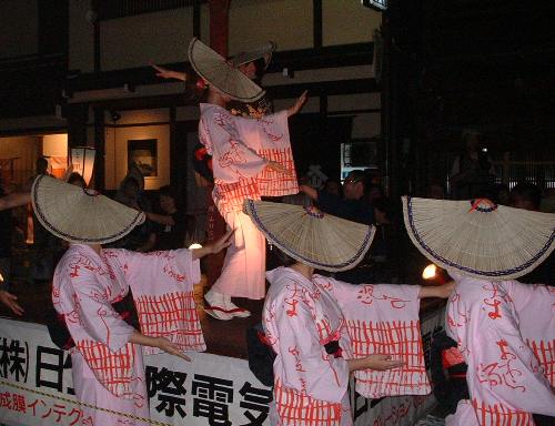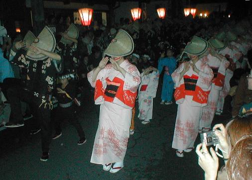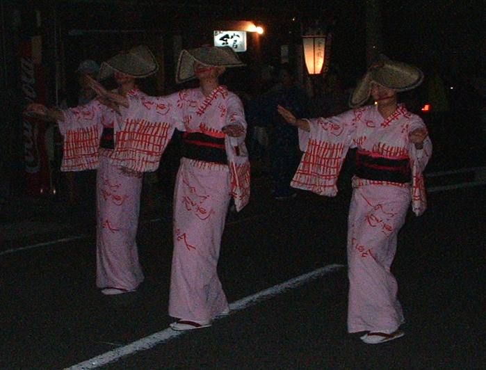 5人の踊り子さんを先頭にして、その後ろを唄い手・三味線・胡弓の「地方」がヨタリながらゆっくり歩き、そのまた後ろをσ(*_*)らがゾロゾロ付いて歩きました。