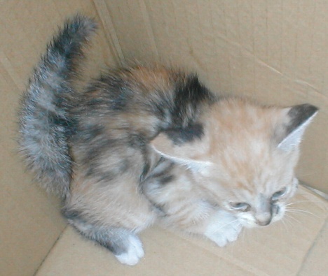 ダンボールに入れられたネコは、黒っぽいのが3匹が固まって、お互い潜り合いしながら泣いております。