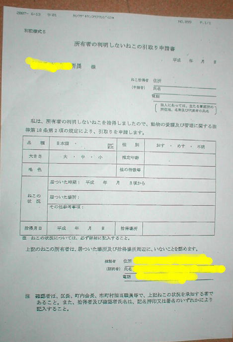 見れば「所有者の判明しないねこの引き取り申請書」という書類でした。