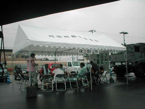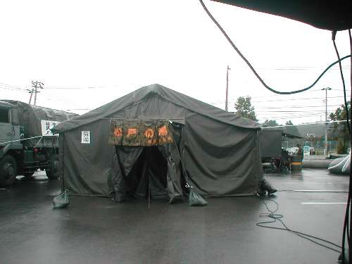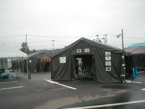 駐車場に自衛隊のテントが張ってあり、受付というのが有りましたが、特に何をするという事でもなく、そのまま風呂のテントへ案内してくれます。