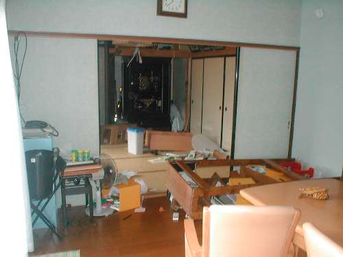 あっ・・こりはネコが住み着いたら困るなぁ・・と思い、息子に材木の整理をさせました。
